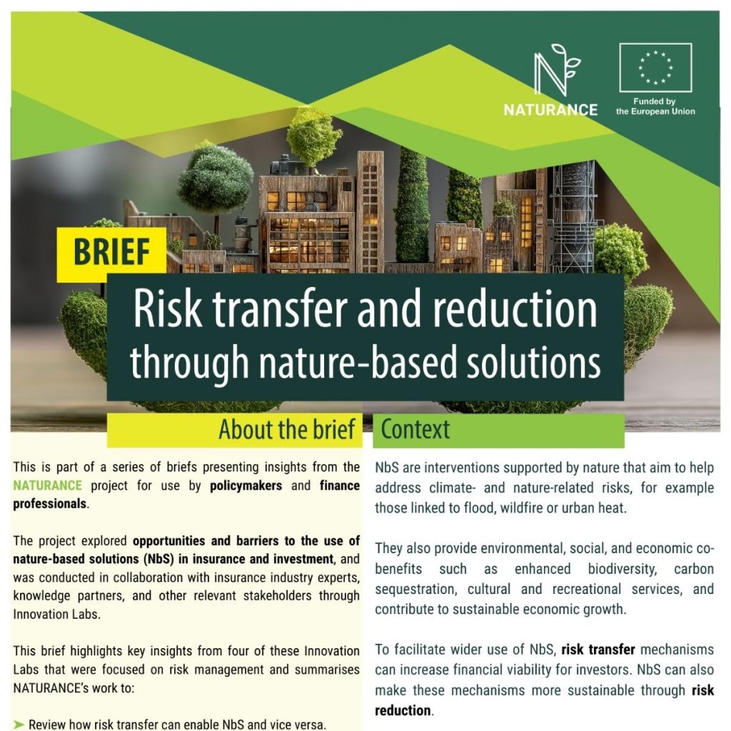 This is part of a series of briefs presenting insights from the NATURANCE project for use by policymakers and finance professionals. This brief highlights key insights from four of the Innovation Labs that were focused on risk management and summarises NATURANCE’s work to: Review how risk transfer can enable NbS and vice versa; Explore opportunities for supporting greater NbS use in the contexts of: Resilience of UK housing and the built environment to withstand flooding; Rising wildfire risk due to climate change and land use pressures; flood risk management in Italy given increased glacial melt/precipitation; Urban heat action plans in Europe.