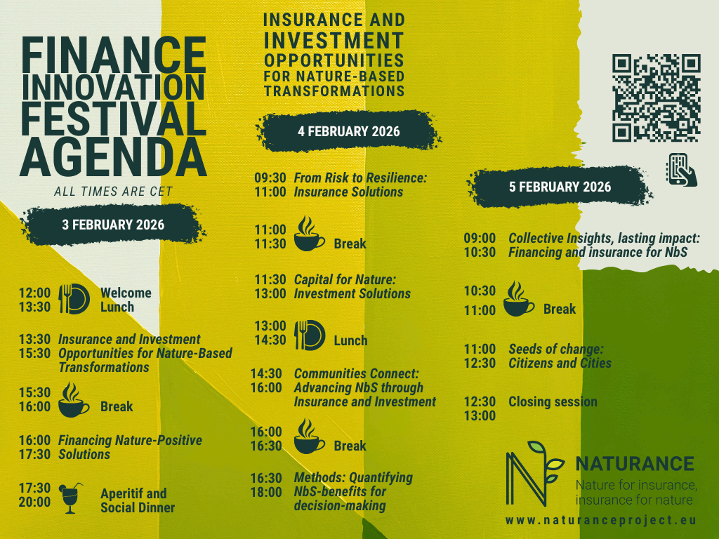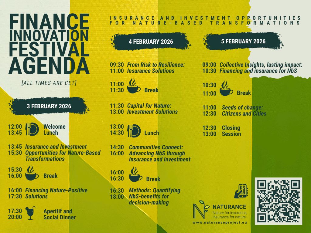 The three-day programme will move from policy discussions on day one, to financing and insurance solutions on day two, and conclude with legacy and future opportunities on day three. As the final edition of the Festival series, the Brussels event will also serve as a culminating moment for NATURANCE, capturing key insights, policy messages, and collaborative legacies that can inform future European action on nature-based finance and insurance.